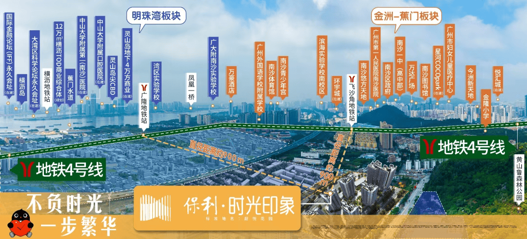 交通的便利性直接决定着生活的幸福感,保利时光印象在这方面给出了满分答案。项目距离飞沙角、广隆双地铁站直线 米,步行十余分钟即可抵达,线 米地铁口” 的便捷出行。从这里出发,1 站可达金洲商圈,2 站到蕉门站换乘 22 号线 号线 分钟就能直达琶洲 CBD、金融城等核心商务区,对于在市区上班的通勤族来说,通勤效率大大提升。未来这里还将汇聚 4 号线 号线 号线四条地铁线,交通优势将进一步升级。自驾出行同样便捷,通过环市大道转明珠湾区跨江隧道(预计 2025 年底建成),约 10 分钟就能到达明珠湾 CBD 的灵山岛尖和横沥岛尖,轻松串联起工作与生活的各个场景。